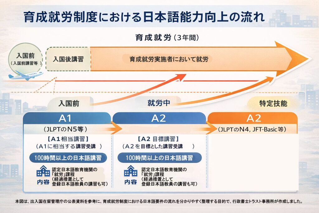 本記事では、出入国在留管理庁が公表している公式資料のみをもとに、育成就労制度における日本語要件について、制度全体の流れが分かるよう整理します。