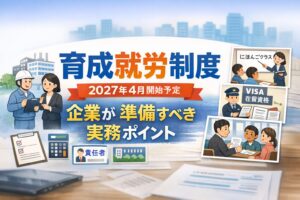 育成就労制度は、人手不足分野で外国人が原則3年間働きながら、特定技能1号につながる技能を身につける制度として設計されています。運用開始は 2027年4月1日 で、事前申請は 2026年度 に予定されています。